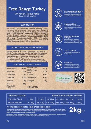 Hypoallergenic, grain-free recipe for small breed senior dogs containing 65% total turkey & pork with a superfood blend. Reduced fat and calorie content to maintain healthy weight and additional L-carnitine for efficient fat metabolism. Contains extra joint care ingredients with naturally occurring collagen to maintain healthy skin and coat. Contains pre-biotics to promote healthy gut bacteria and to support digestion.